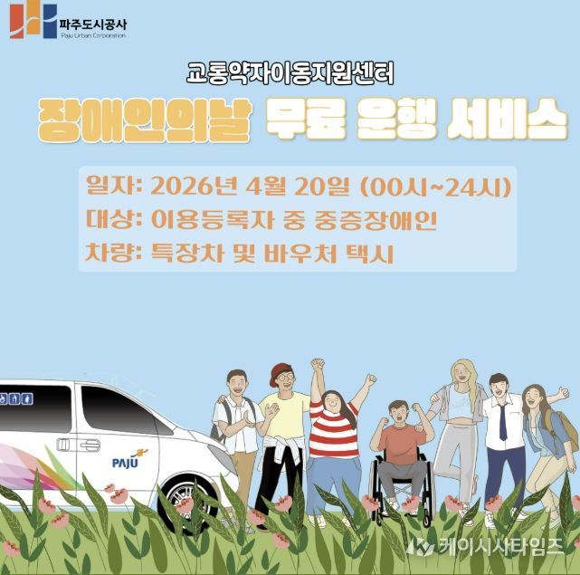 (케이시사타임즈) 파주도시공사 교통약자이동지원센터에서는 오는 4월 20일 장애인의 날을 맞아 교통약자를 위한 무료 운행 서비스를 실시한다.