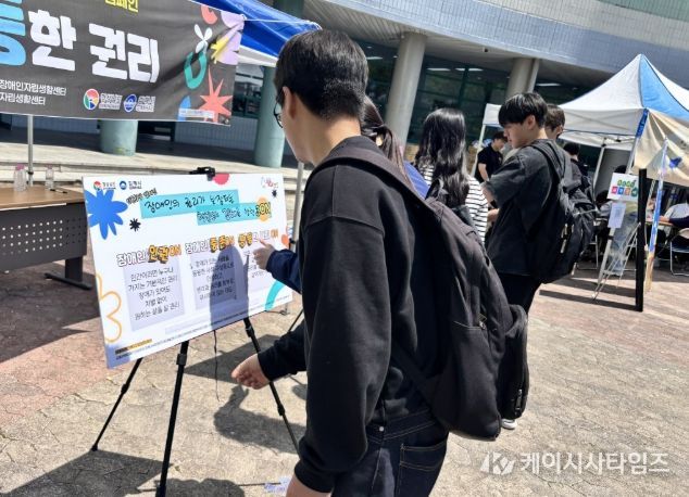 (케이시사타임즈) (재)김해시복지재단 김해시장애인종합복지관(관장 류재복)은 김해장애인복지기관네트워크 합동으로 지난 13일부터 15일까지 3일간 지역 내 대학생들을 대상으로 장애인식개선 캠페인 ‘동정이 아닌, 동등한 권리’을 진행했다.
