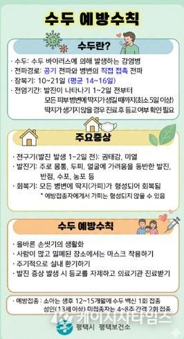 (케이시사타임즈) 평택시는 최근 전국적으로 수두 환자가 증가하는 가운데, 관내에서도 수두 신고가 지속됨에 따라 집단시설 및 가정 내 예방수칙 준수를 당부했다.