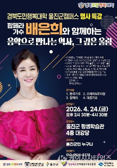 울진군 관계자는 “이번 명사 특강이 경북도민행복대학 강의를 수강하는 학생들뿐만 아니라 군민들 모두가 일상 속에서 문화적 여유를 느끼고, 음악을 통해 새로운 시각으로 역사를 이해하는 뜻깊은 시간이 되길 바란다” 며 “앞으로도 군민의 삶의 질 향상을 위한 다양한 평생학습 프로그램을 지속적으로 운영해 나가겠다” 라고 전했다.