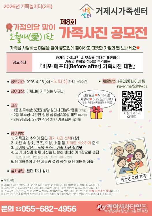 (케이시사타임즈) 거제시가족센터가 5월 가정의 달을 맞아 가족의 소중함을 고취하고 가족친화 문화 조성을 위해‘2026년 제8회 가족사진 공모전’을 개최한다고 밝혔다.