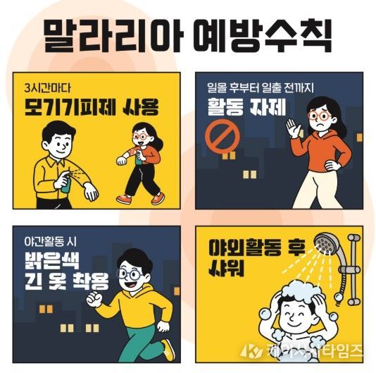 말라리아 예방을 위해서는 모기에 물리지 않는 등 예방 수칙을 준수하는 것이 가장 중요하다. 말라리아 다발생 지역에 거주하거나 여행하는 경우 모기가 활발하게 활동하는 시기(5~10월)에 ▲야간활동 자제 ▲긴소매와 긴바지 옷 착용 ▲기피제 사용 ▲야외 취침 시 모기장 사용 등의 수칙을 지키는 것이 중요하다.