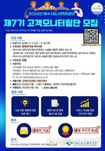 (케이시사타임즈) 여수시도시관리공단은 시민 참여를 기반으로 공단 시설과 서비스 품질을 점검하고 개선하기 위한 '2026년 제7기 고객모니터링단'을 모집한다고 밝혔다.