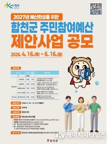 (케이시사타임즈) 합천군은 2027년도 예산편성을 위한 주민참여예산 제안사업 공모를 6월 16일까지 실시하며, 올해부터 공모 분야를 기존 1개 모델 3개 유형에서 3개 모델 5개 유형으로 확대 개편한다고 밝혔다.