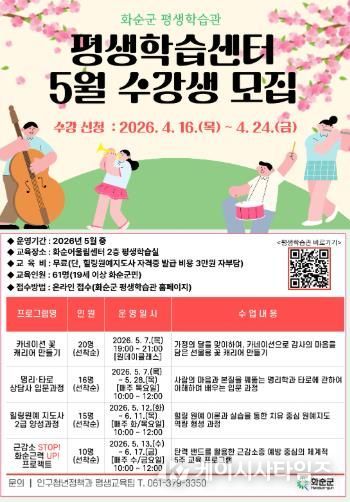 (케이시사타임즈) 화순군은 찾아가는 전남형 평생학습 공모사업과 연계해 군민의 자기계발과 건강한 여가 활동 지원을 위해 ‘5월 평생학습센터 프로그램’ 수강생을 모집한다고 밝혔다.