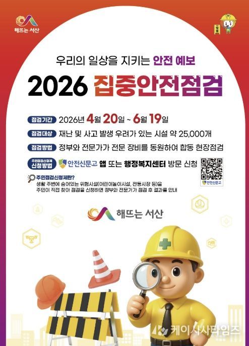 (케이시사타임즈) 충남 서산시는 4월 20일부터 6월 19일까지 ‘2026년 집중안전점검’을 진행한다고 밝혔다.