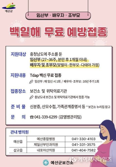 (케이시사타임즈) 예산군은 건강한 출산과 양육 환경 조성을 위해 백일해 무료 예방접종 지원 사업을 확대 시행하고 있다.