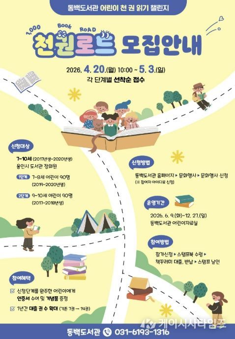 (케이시사타임즈) 용인특례시 동백도서관은 어린이 천 권 읽기 챌린지 ‘천권로드(ROAD)’ 참여자를 모집한다고 20일 밝혔다.