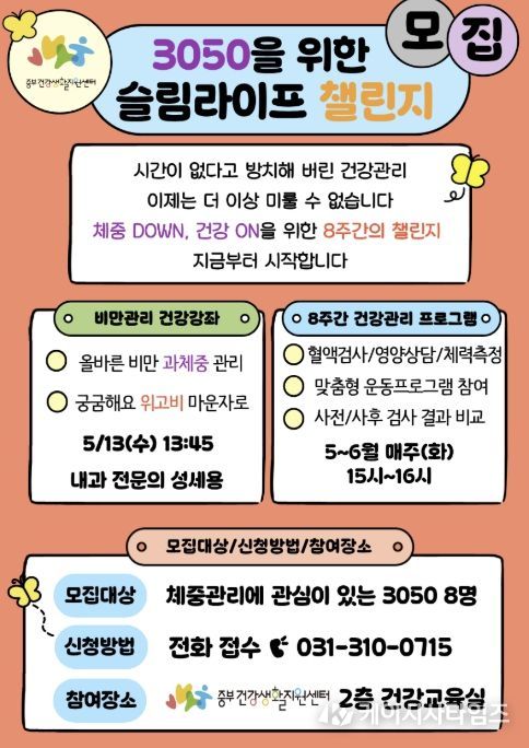 (케이시사타임즈) 시흥시 중부건강생활지원센터는 비만 위험 요인이 있는 30~50대 성인을 대상으로 건강한 생활 습관 형성과 만성질환 예방을 위한 ‘슬림라이프 챌린지’를 운영하며 참여자를 모집한다.