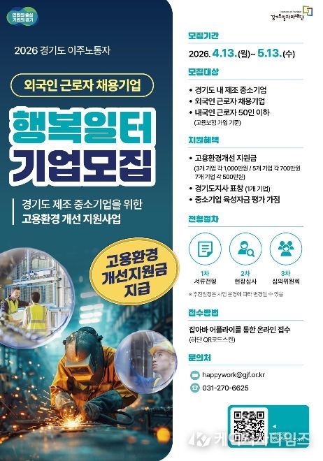 (케이시사타임즈) 경기도와 경기도일자리재단은 도내 외국인 근로자를 고용한 중소 제조기업을 대상으로 ‘2026년 경기도 이주노동자 행복일터 선정사업’ 참여기업을 모집한다고 20일 밝혔다.