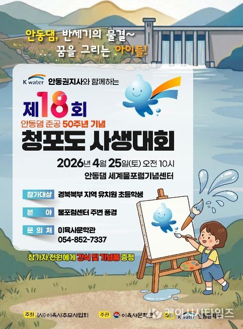 이번 대회는 안동댐 준공 50주년을 기념해 마련된 행사로, 유치원생과 초등학생을 대상으로 진행된다. 참가자들은 대회 당일 접수처에서 배부하는 8절지에 세계물포럼기념센터 주변 풍경을 자유롭게 그리면 된다.