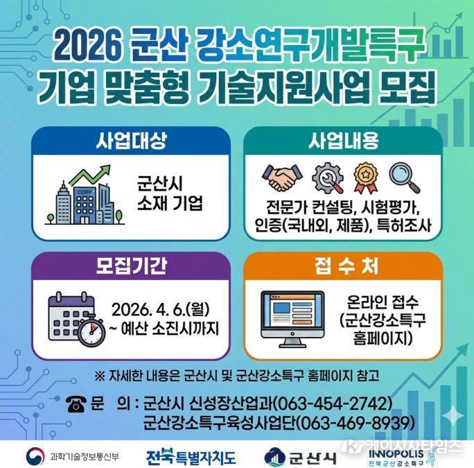 (케이시사타임즈) 군산시는 관내 기업의 기술 경쟁력 강화를 위해 ‘2026년 군산 강소연구개발특구 기업 성장단계별 기술지원사업’을 본격 추진한다고 밝혔다.