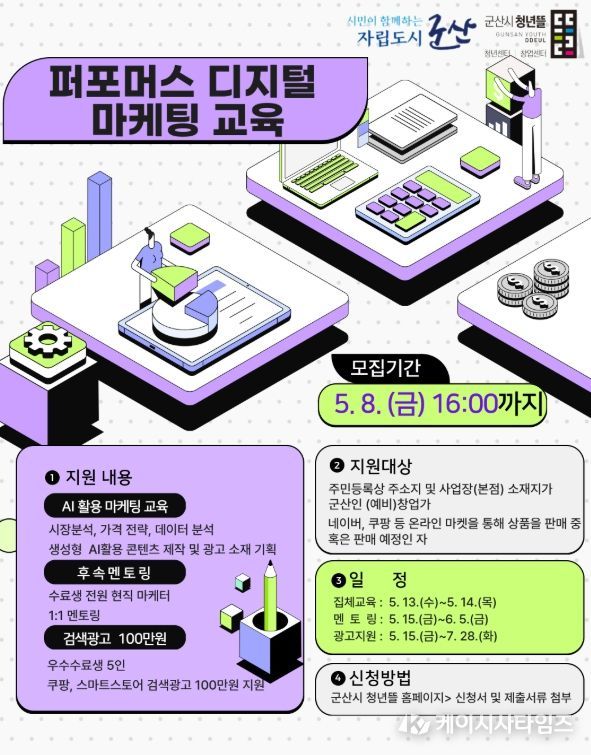 (케이시사타임즈) 군산시 청년뜰 창업센터가 4월 20일부터 5월 8일까지 지역 온라인 창업가의 디지털 마케팅 역량 강화를 위한 '2026년 퍼포먼스 디지털 마케팅 교육' 참여자를 모집한다.