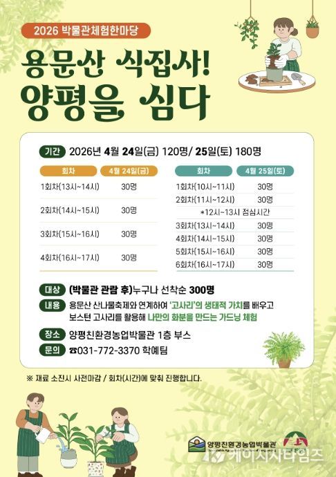 (케이시사타임즈) 양평친환경농업박물관은 오는 4월 24일부터 25일까지 이틀간 2026년 ‘박물관체험한마당’ 체험 프로그램을 운영한다.