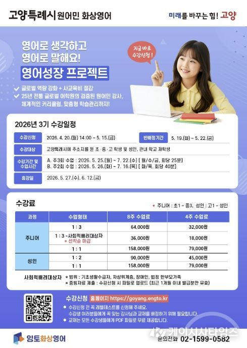 (케이시사타임즈) 고양특례시는 글로벌 역량 강화와 사교육비 부담 완화를 위한 ‘원어민 화상영어’ 프로그램의 3기 수강생을 4월 20일부터 5월 15일까지 모집한다.