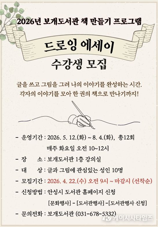 (케이시사타임즈) 안성시 보개도서관(책문화센터)이 시민들의 창작 활동을 지원하고 일상 속 예술 경험을 확대하기 위해 오는 5월부터 ‘드로잉 에세이’와 ‘포토 에세이’ 책 만들기 프로그램을 새롭게 운영한다고 밝혔다.
