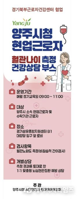 건강상담 부스는 오는 4월 22일 오전 9시, 양주시 소속 현업근로자 및 수탁기관 근로자 400여 명을 대상으로 하는 정기 안전보건교육 현장(경기섬유종합지원센터 지하 1층 대강당 로비)에서 첫선을 보인다.