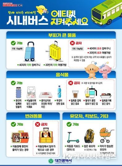 홍보물은 시민들이 쉽게 이해할 수 있도록 그림 중심으로 제작됐으며, 주요 내용은 ▲대형 물품: 소형 캐리어는 가능하나, 과도한 크기·무게 물품은 제한 ▲음식물: 밀폐 용기 및 포장 음식은 가능하나, 일회용 컵 음료는 제한 ▲반려동물: 이동장에 완전히 수용된 경우에만 탑승 가능 ▲유모차·킥보드 등: 저상버스에서는 유모차를 접지 않고 탑승이 가능하고, 접은 유모차는 모든 버스에 탑승 가능 등이다.