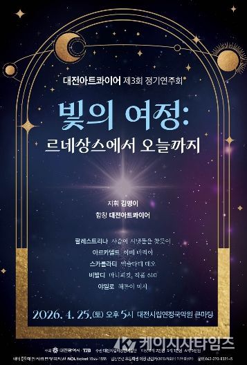 (케이시사타임즈) 대전아트콰이어는 4월 25일 오후 5시, 대전시립연정국악원 큰마당에서 제3회 정기연주회‘빛의 여정: 르네상스에서 현대까지’를 개최한다.