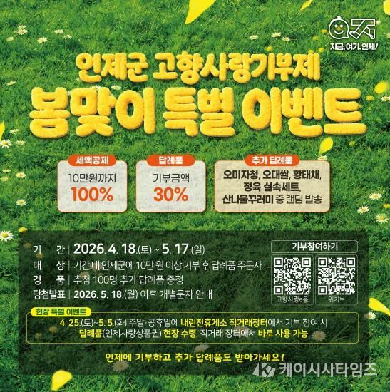 김장웅 인제군 지역발전과장은 “봄철 인제군을 찾는 방문객들에게 고향사랑기부제를 자연스럽게 알리고 참여를 독려하기 위해 이번 이벤트를 마련했다”며, “고향을 사랑하는 마음으로 기부하고 세액공제와 답례품 혜택은 물론, 지역 농특산물 소비 활성화에도 동참하는 뜻깊은 기회가 되길 바란다”고 말했다.