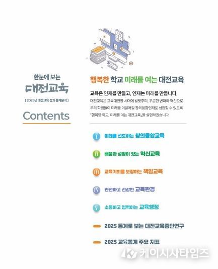 (케이시사타임즈) 대전교육과학연구원 대전교육정책연구소는 2025년 대전교육 주요 정책의 성과를 종합적으로 분석한 ‘한눈에 보는 대전교육’을 발간했다고 밝혔다.