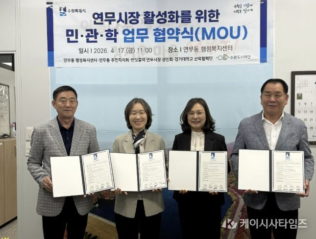 (케이시사타임즈) 수원시 장안구 연무동 행정복지센터와 주민자치회, 반딧불이연무시장상인회, 경기대학교 산학협력단은 지난 17일, 각 기관의 긴밀한 상호 협력과 유대관계 강화를 위한 업무협약을 체결했다.