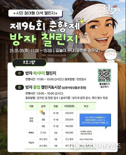 특히 그간 춘향과 몽룡에 가려져 있던 감초 캐릭터 ‘방자’를 전면에 내세웠다는 점에서 눈길을 끈다. 남녀노소 누구나 역동적으로 즐길 수 있도록 기획된 이번 챌린지는 5월 5일 오전 11시, 길놀이무대에서 본격적인 막을 올린다.