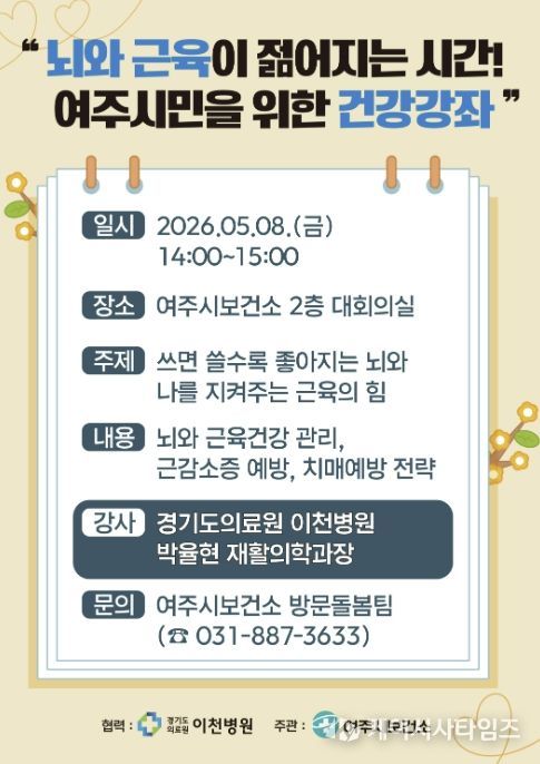 (케이시사타임즈) 여주시보건소 건강증진과는 오는 5월 8일 오후 2시, 보건소 2층 대회의실에서 여주시민을 위한 건강강좌 '뇌와 근육이 젊어지는 시간!'을 개최한다고 밝혔다.