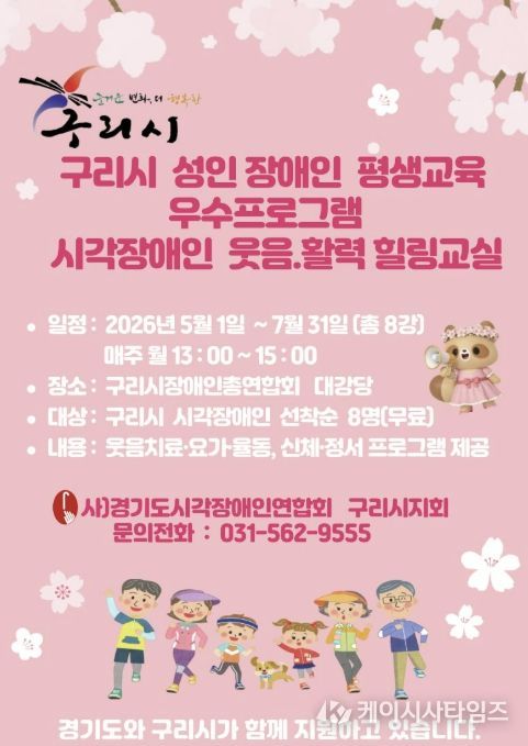 (케이시사타임즈) 사단법인 경기도시각장애인연합회 구리시지회는 구리시와 경기도의 지원을 받아 2026년 5월부터 ‘시각장애인 웃음·활력 힐링 교실’을 운영할 예정이라고 밝혔다.