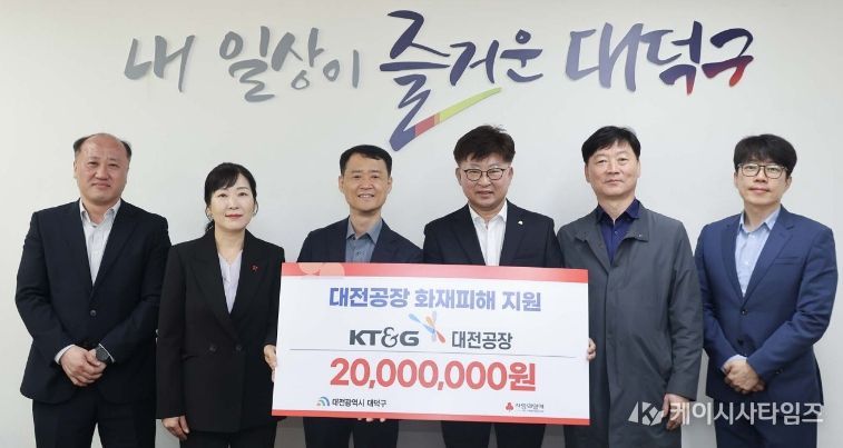 대덕구 관계자는 “어려운 상황에 놓인 우리 지역의 이웃을 위해 큰 나눔을 실천해 주신 KT&G 대전공장에 깊이 감사드린다”며 “소중한 성금이 피해 주민들에게 실질적인 도움이 될 수 있도록 최선을 다하겠다”고 말했다.