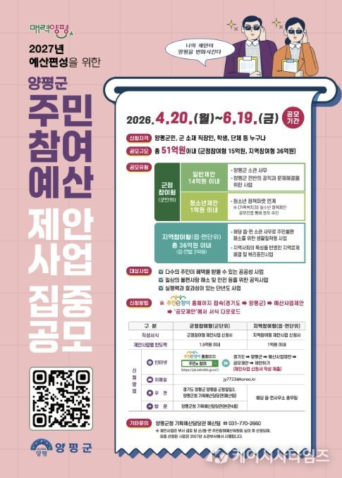 (케이시사타임즈) 양평군은 오는 6월 19일까지 2027년 예산에 반영할 ‘주민참여예산 제안사업’을 집중 공모한다고 밝혔다.