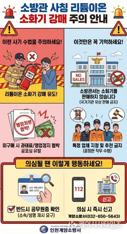 (케이시사타임즈) 계양소방서는 최근 소방공무원을 사칭해 리튬배터리용 소화기 등 물품 구매를 요구하는 사기 행위가 발생하고 있다며 시민들의 각별한 주의를 당부했다.