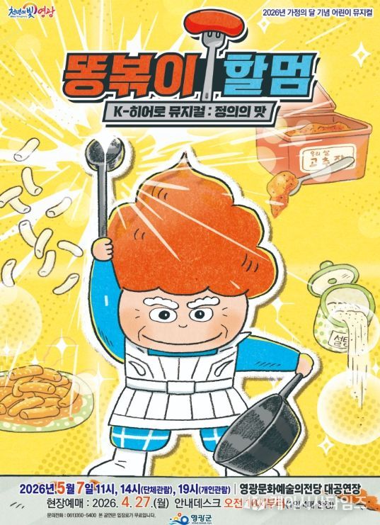 (케이시사타임즈) 영광군은 오는 5월 7일 오전 11시(단체관람), 오후 2시(단체관람), 7시에 영광문화예술의전당 대공연장에서 가정의 달 특집공연 웃음과 감동, 그리고 건강한 메시지를 전하는 이야기 ‘어린이뮤지컬 똥볶이 할멈’을 공연한다.