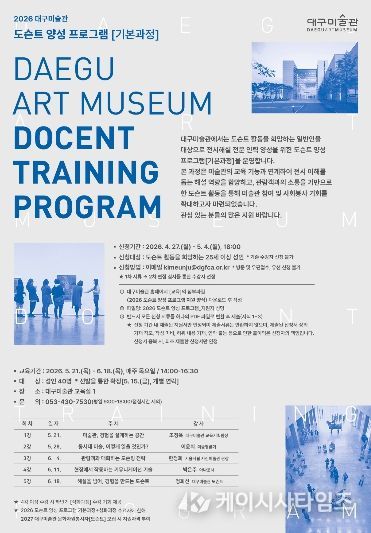 (케이시사타임즈) 대구문화예술진흥원 대구미술관은 도슨트 활동을 희망하는 25세 이상 일반인을 대상으로 전시 해설 전문 인력 양성을 위한 ‘도슨트 양성 프로그램(기본과정)’을 운영하고, 2026년 교육생을 모집한다.