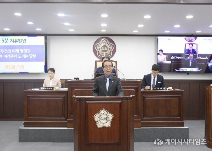 (케이시사타임즈) 동두천시의회 박인범 의원(더불어민주당, 나선거구)이 제345회 임시회 폐회식에서 시의원으로서의 마지막 5분 자유발언에 나섰다. 제1대, 제8대, 제9대 동두천시의원과 제8대 경기도의회 의원을 거친 박 의원은 이번 임기를 끝으로 의정활동을 마무리하며, 공직자들에게 '시민이 찾아오는 동두천'을 향한 당부의 메시지를 전했다.