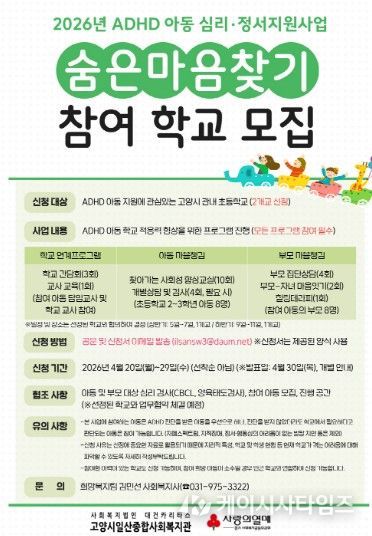 (케이시사타임즈) 고양시일산종합사회복지관은 ADHD 아동의 학교 적응을 돕기 위한 심리·정서지원사업 ‘숨은마음찾기’에 참여할 학교를 모집한다고 21일 밝혔다.