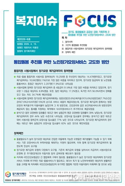 (케이시사타임즈) 경기복지재단(대표이사 이용빈)은 통합돌봄 정착을 위한 노인장기요양서비스 고도화 방안을 주제로 '복지이슈포커스 제6호' 보고서를 발간했다.