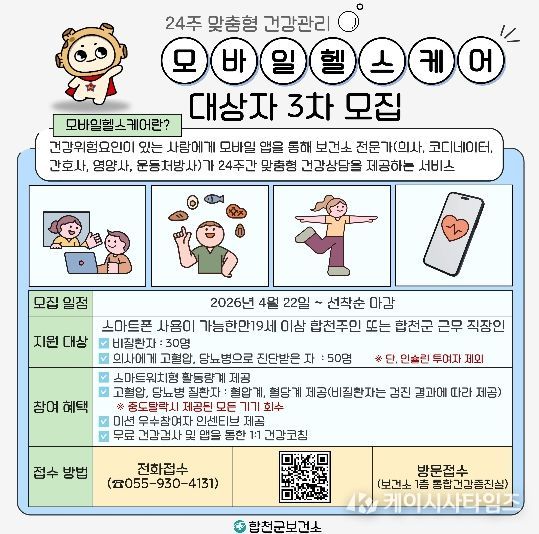 (케이시사타임즈) 합천군보건소(소장 안명기)는 22일부터 모바일헬스케어 대상자 3차 모집을 시작한다.