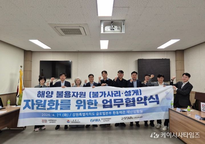 (케이시사타임즈) 강원특별자치도 제2청사(본부장 손창환)는 4월 21일 강원특별자치도청 제2청사 환동해관에서 강릉시, 한국수산자원공단, ㈜스타스테크와 함께 ‘해양 불용자원 자원화’를 위한 업무협약을 체결했다고 밝혔다.