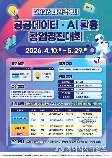 (케이시사타임즈) 대전시는 공공데이터와 인공지능(AI)을 기반으로 지역사회 현안을 해결할 창의적인 아이디어와 혁신적인 비즈니스 모델을 발굴·지원하기 위해‘2026년 대전광역시 공공데이터·AI 활용 창업경진대회’를 개최한다.