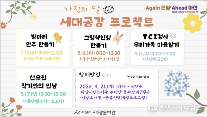 (케이시사타임즈) 아산시 배방도서관이 5월 가정의 달을 맞아 가족 간 소통과 유대감 강화를 위한 ‘세대공감 프로젝트’를 운영한다.