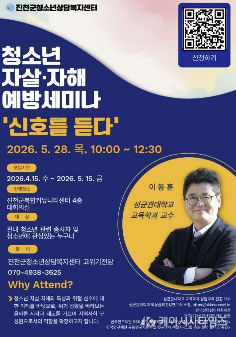 (케이시사타임즈) 충북 진천군청소년상담복지센터는 오는 5월 28일 진천군복합커뮤니티센터에서 청소년 자살·자해 예방 세미나 ‘신호를 듣다’를 개최한다고 밝혔다.
