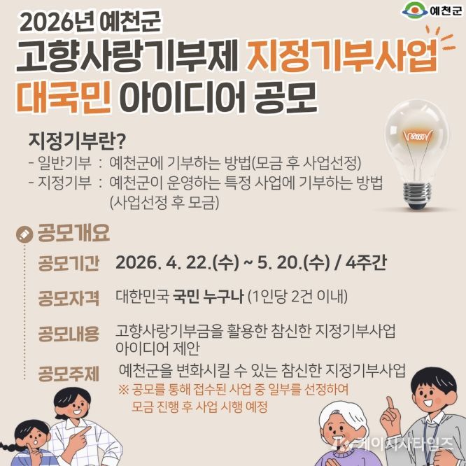 (케이시사타임즈) 예천군은 기부자가 사업 목적에 공감하고 직접 수혜 대상을 결정하는 ‘고향사랑 지정기부제’를 적극 도입하기로 하고, 그 첫걸음으로 4월 22일부터 5월 20일까지 '2026년 예천군 고향사랑기부제 지정기부사업 아이디어 공모전'을 열어 국민들의 참신한 제안을 받는다.