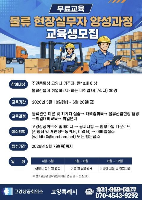 (케이시사타임즈) 고양특례시는 2026년 고양맞춤형 일자리학교 공모에 선정된 ‘물류 현장실무자 양성과정’에 참여할 교육생을 오는 5월 7일까지 모집한다.