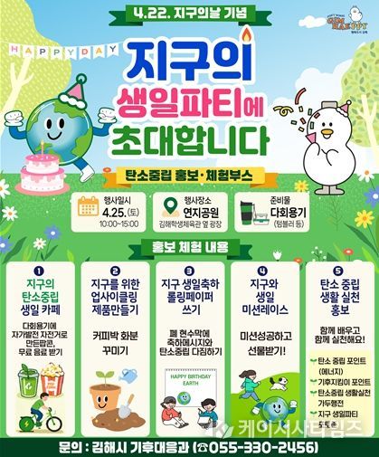 (케이시사타임즈) 김해시는 지구의 날(4.22)을 기념한 제18회 기후변화주간을 맞아 오는 25일 오전 10시부터 오후 3시까지 연지공원에서 탄소중립 체험 행사‘지구의 생일파티에 초대합니다’를 운영한다고 22일 밝혔다.