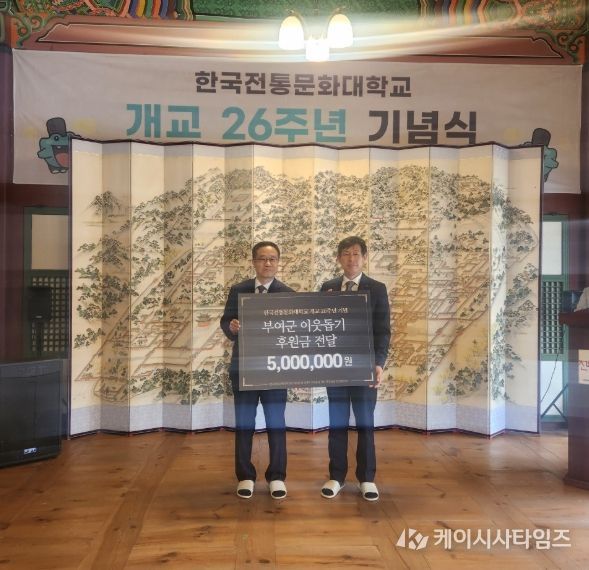 (케이시사타임즈) 한국전통문화대학교 교직원일동은 개교 26주년 기념행사에서 저소득 가구의 초·중·고 학생 장학금으로 사용해 달라며 이웃돕기 성금 500만 원을 부여군에 기탁했다고 22일 밝혔다.