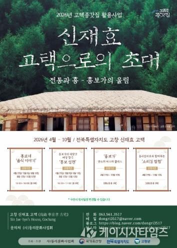 (케이시사타임즈) 고창군이 (사)동리문화사업회와 국가유산청 고택·종갓집 활용사업으로 ‘신재효 고택으로의 초대’를 고창 신재효 고택과 판소리공원 일대에서 오는 25일부터 10월까지 본격 운영한다고 밝혔다.