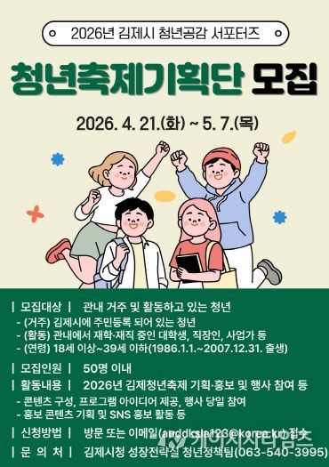 (케이시사타임즈) 김제시는 청년이 주도하는 축제 기획을 통해 지역 청년 참여를 확대하고 활력을 불어넣고자 '청년축제기획단(김제시 청년공감 서포터즈)'을 모집한다고 밝혔다.