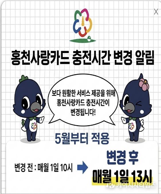 (케이시사타임즈) 홍천군은 홍천 사랑 카드 이용 편의를 높이고 보다 안정적인 서비스를 제공하기 위해 카드 충전 가능 시간을 변경해 운영한다고 밝혔다.
