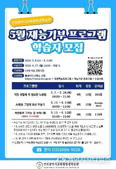 (케이시사타임즈) 인천광역시교육청평생학습관은 오는 27일부터 시민의 재능을 나누는 ‘재능기부 프로그램’ 학습자를 모집한다.